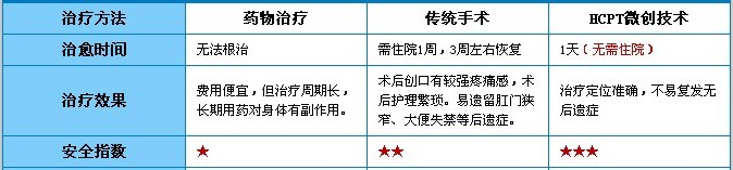 HCPT微创技术——HCPT微创术是目前中重度疑难脱肛患者治疗的选择之一,具有微创、痛苦小、出血少、恢复快、无需住院、不影响工作和学习等优势。HCPT的脱肛手术各地收费情况不尽相同,但手术的实质是一样的。治疗及费用要根据病情来定。病情不一样,治疗费用也是不同的。