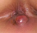 症状三、肿物脱出:肛门内部出现肿物脱出,这主要是中晚期内痔的症状。随着内痔痔核的不断增大,使粘膜及粘膜下层与肛层分离,排便时,内痔结节可下降到齿状线以下,游离于肛管之外,经肛门脱出。轻者只有在排便时才会脱出肛外,重者在咳嗽、压腹、用力下蹲时即可脱出。